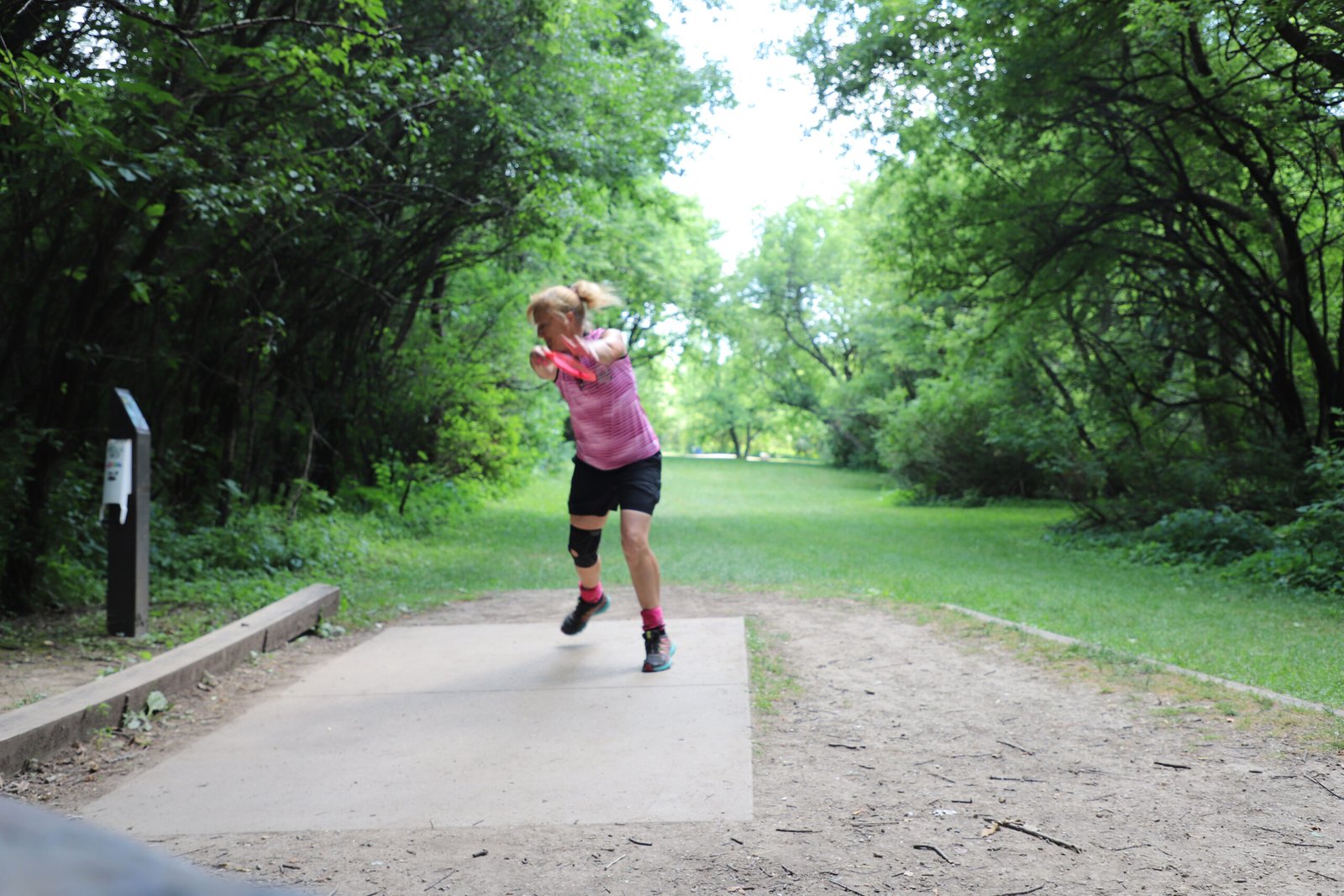 “Getting an eagle on hole 10 on day three of USWDGC at Hiestand was a huge highlight for me. Love the course (was made with the concessions money from 1993 WFDF Ultimate World Championships in Madison, which I was on the board running), and that hole is a gorgeous challenge, long, sinuous with a lot of opportunity for troubling rolls, due to the rolling hills nature of the hole. Cosmic Kahu was my driver, and it S curved exactly the way I hoped, leaving me mostly flat footing, about 250 out from the hole (did I mention it is downhill to the hole with a lot of downhill rollaway into the rough opportunities?). Cosmic Piwakawaka was my upshot choice, despite its potential for long glide. Rode the curve of the hill along the right side rough, and settled uphill of the basket by about 15 feet. Soft Magma Tui was my rock star putter at Hiestand.