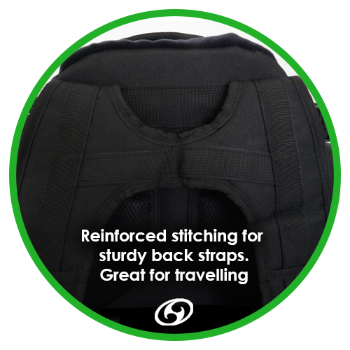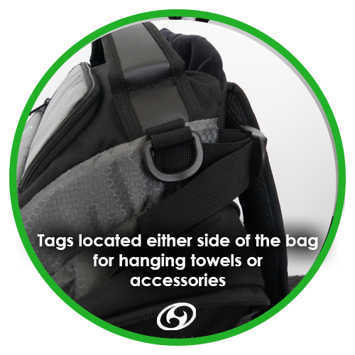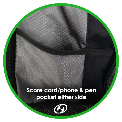 On the rear are a padded set of straps and a sternum strap, combined with a stiff cushioned support makes for an extremely comfortable fit that is easy to carry for multiple rounds. We have designed the back straps of the Tahi Nui to be suitable for traveling (getting in and out of the car). They are thick with reinforced stitching. All straps are adjustable. The bag’s grab handle is wide and distributes the weight of the bag comfortably in your hand. There is an umbrella/stool holder either side of the bag, as well as two 1.5L drink bottle holders. Score card and pen holders can also be found on the sides of the bag, with extra pockets located on the inside of the extendable sides. At the very front of the bag we have also included another pocket suitable for holding your mini discs.