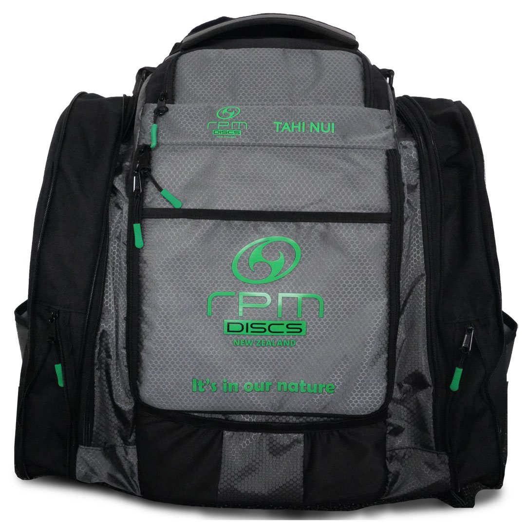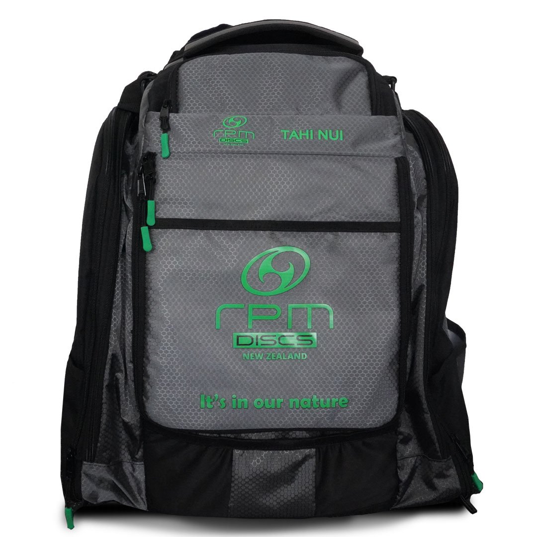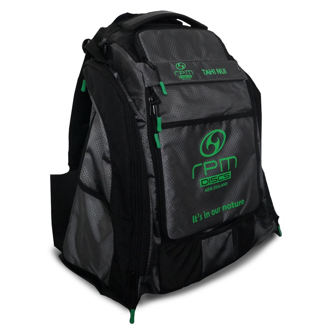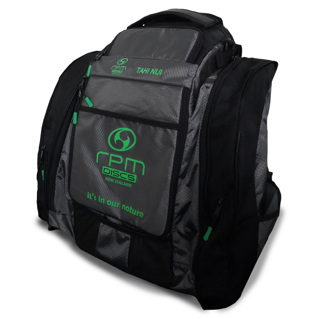 The RPM Tahi Nui is a genuinely large, ruggedly constructed Disc Golf backpack designed for touring professionals and serious amateurs. It has all the space and fixings you need for discs, accessories, food and drink when battling the elements on the course for many hours.
