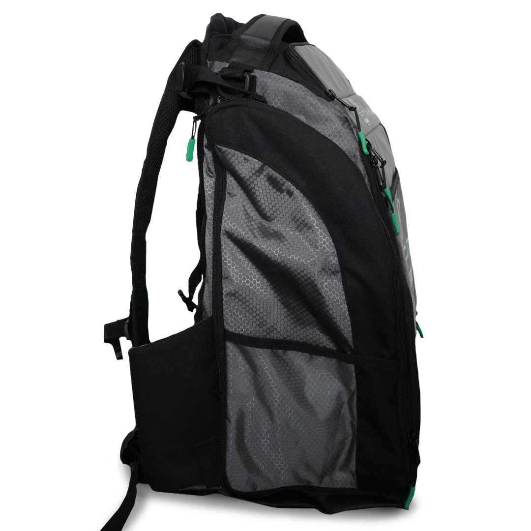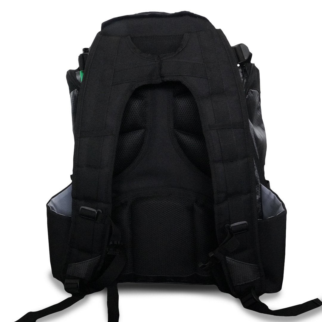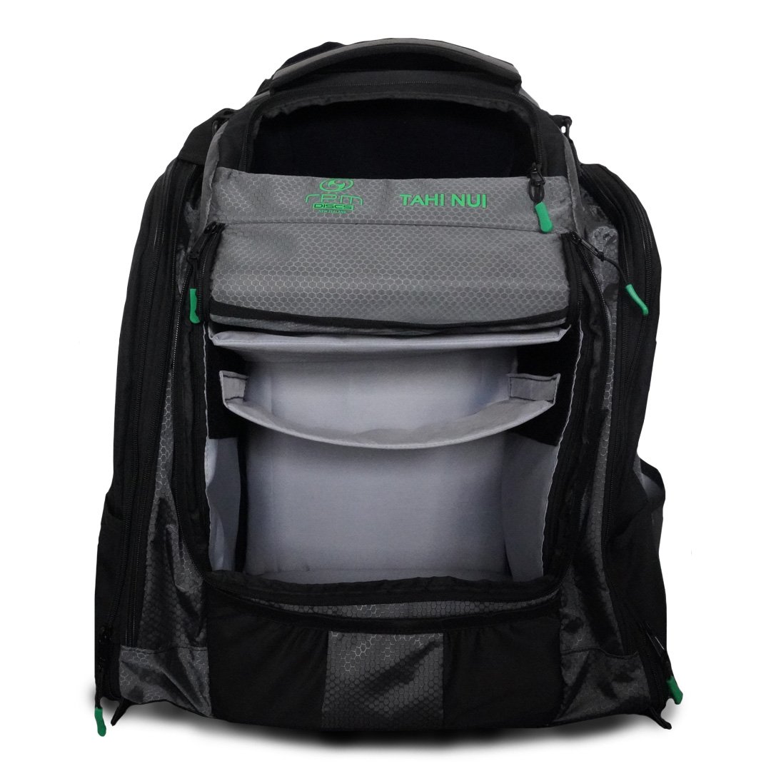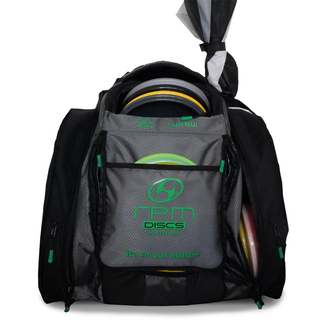 The RPM Tahi Nui is a genuinely large, ruggedly constructed Disc Golf backpack designed for touring professionals and serious amateurs. It has all the space and fixings you need for discs, accessories, food and drink when battling the elements on the course for many hours.